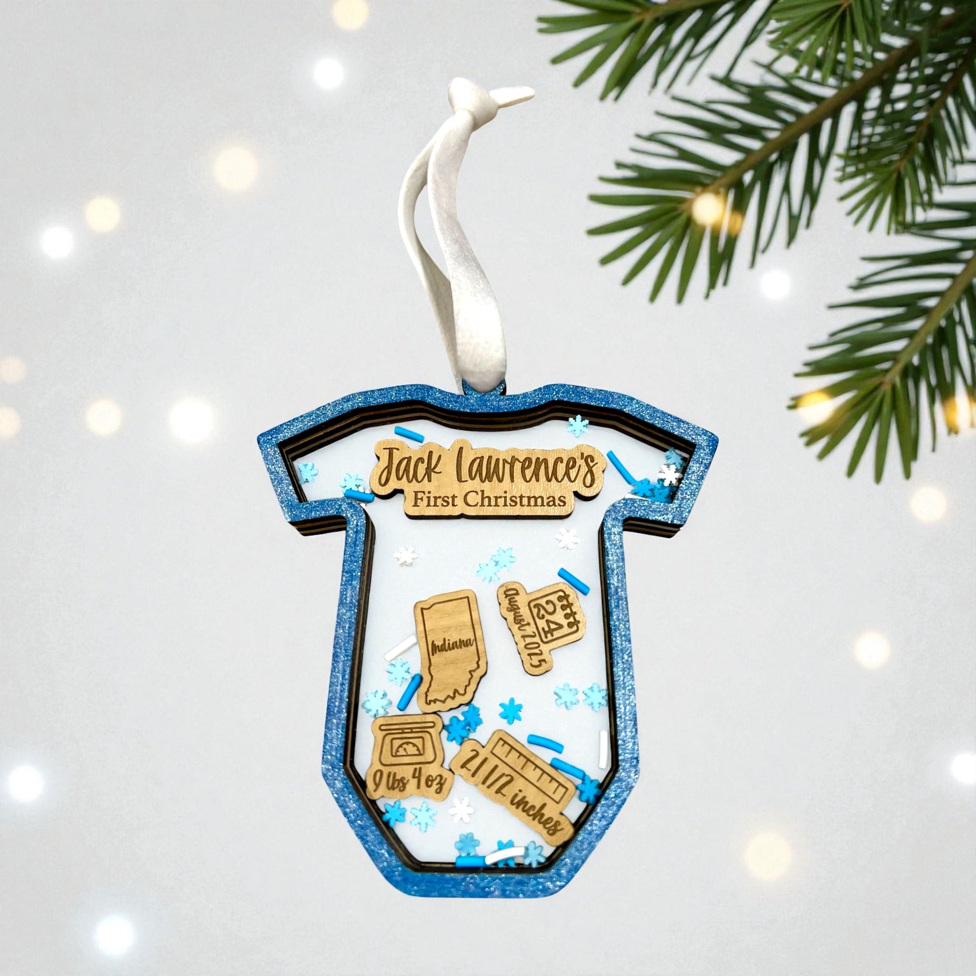 - Personalization: The ornament can be customized with your baby's first and middle name, date, time and location of birth, birth weight and length.