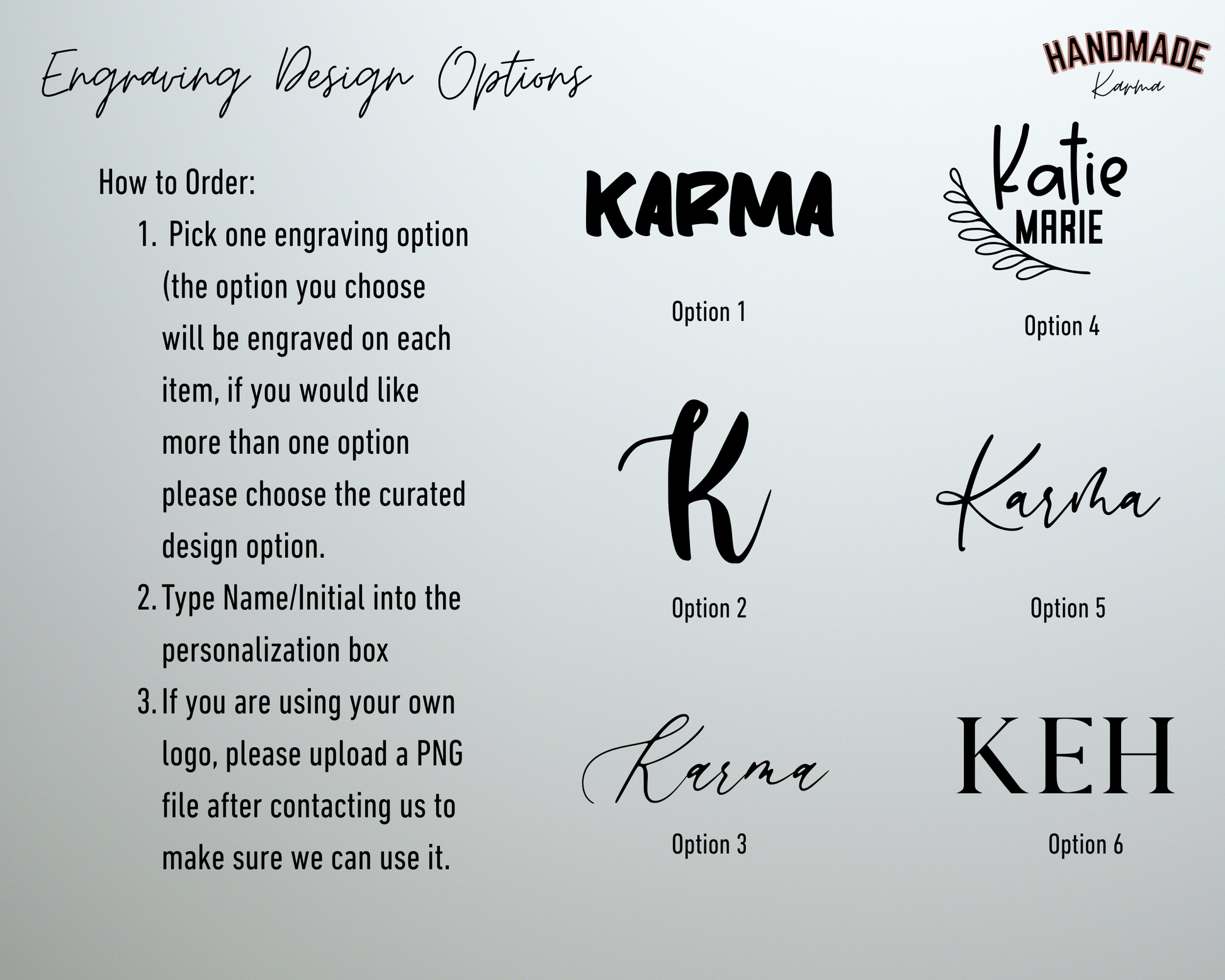 To Order: Please choose 1 engraving option (if you’d like more than one option please choose the curated bag $39.99). In the personalization box, please type what engraving option you would like. If choosing more than 1 please list what option for each item. Also don’t forget to include the name/initials.