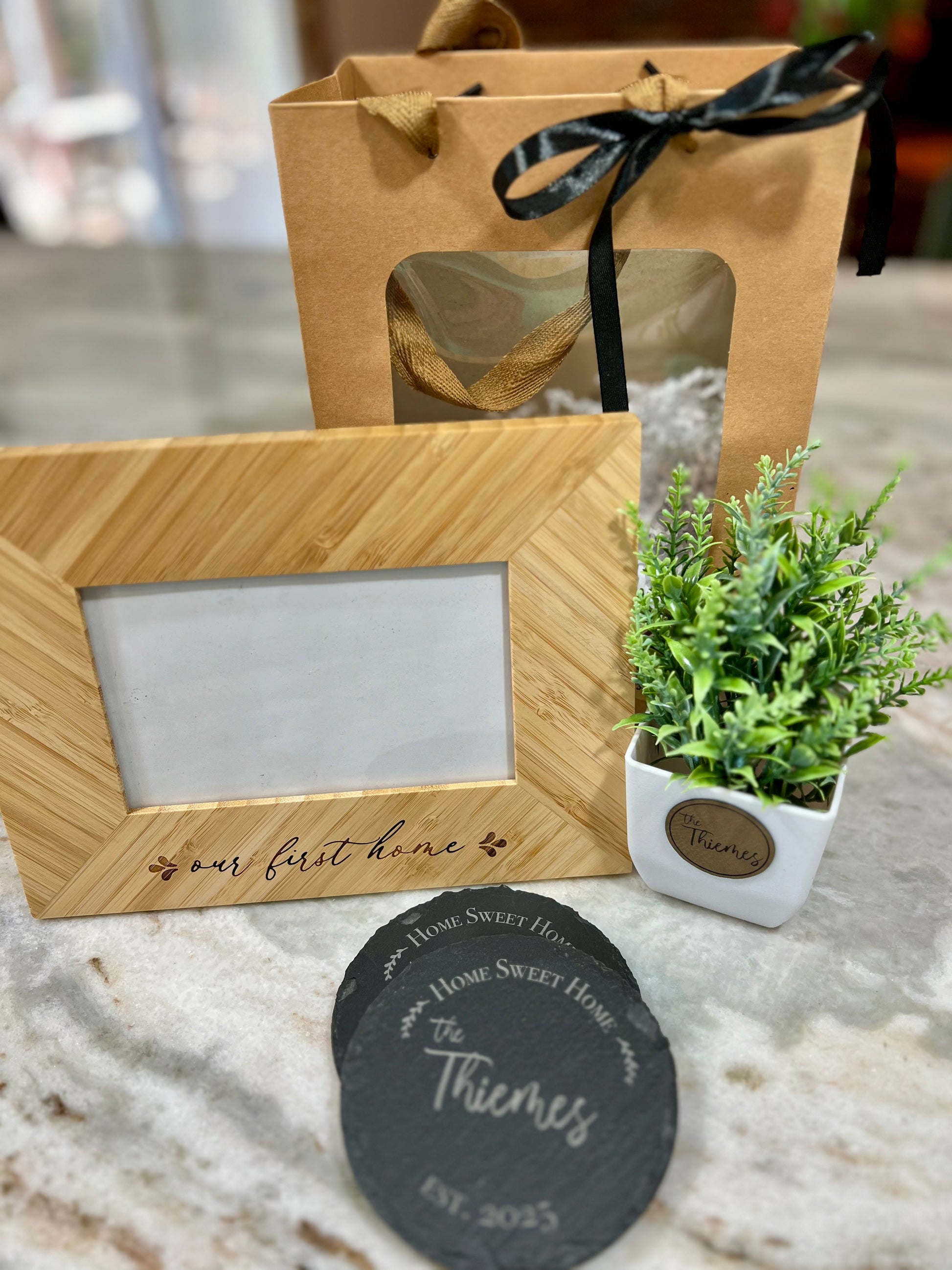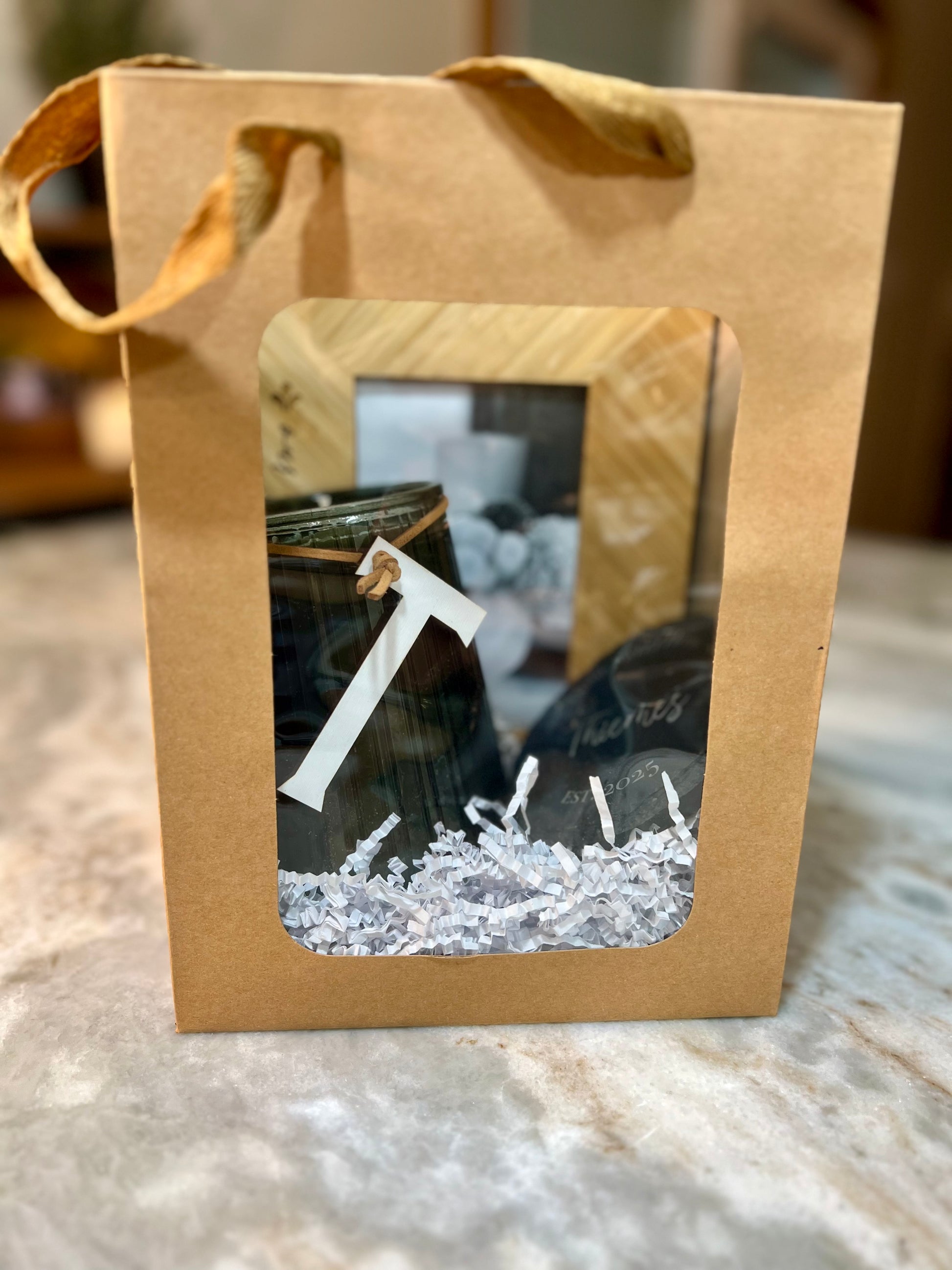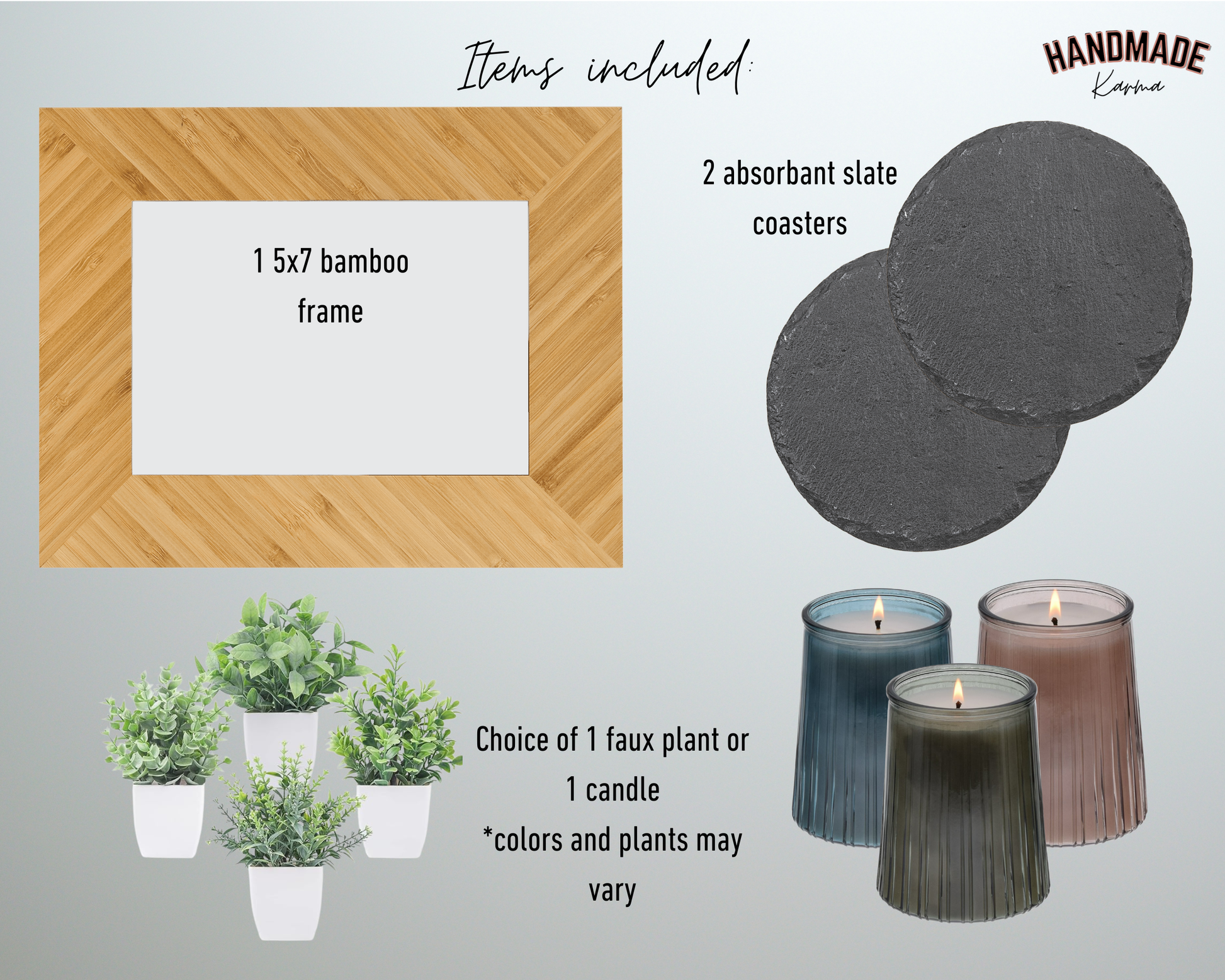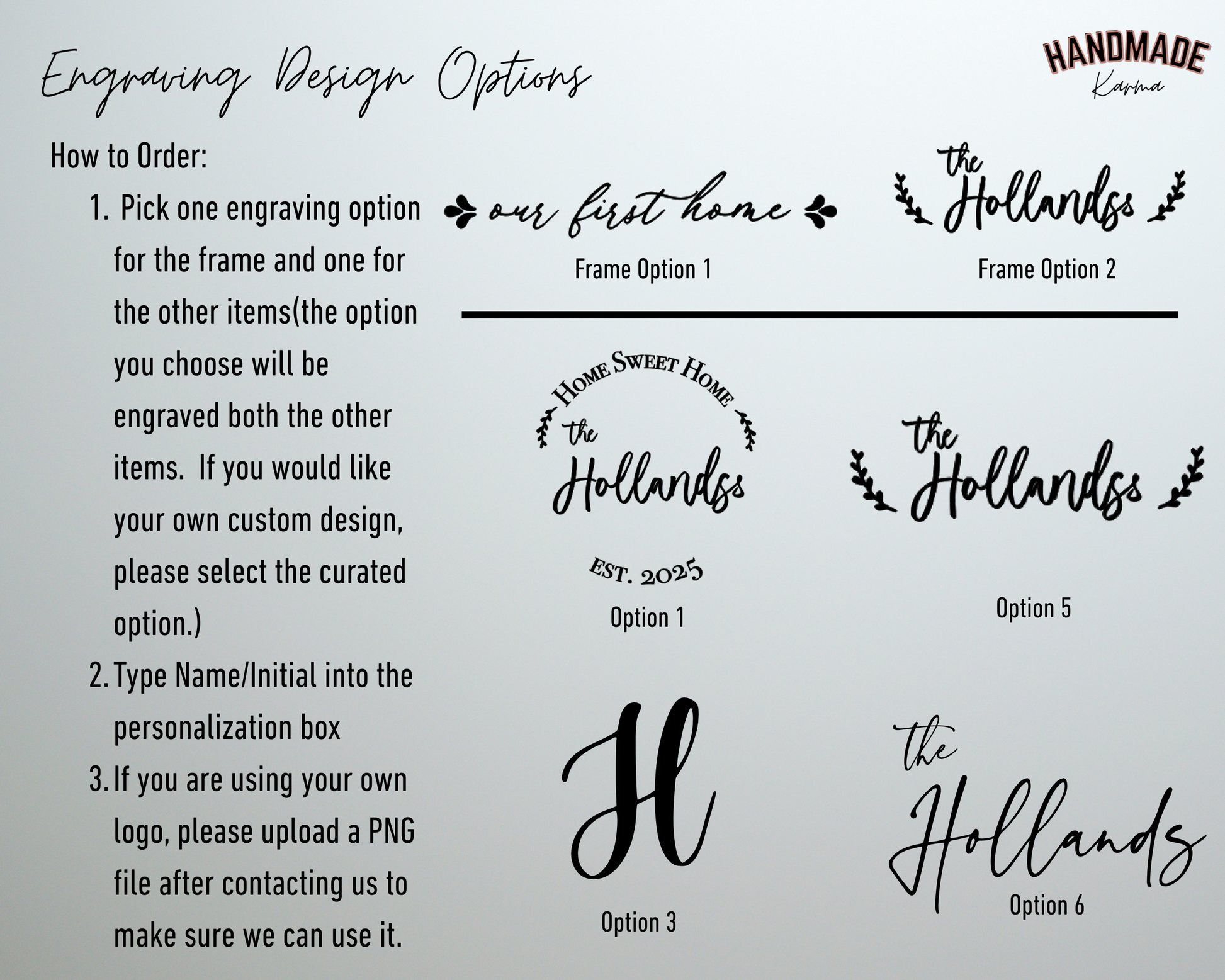 To Order: Please choose 1 engraving option for the frames and 1 for everything else(if you’d like more than one option please choose the curated bag $39.99). In the personalization box, please type what engraving option and choice of candle or plant you'd like. If choosing more than 1 please list what option for each item. Also don’t forget to include the name/initials.